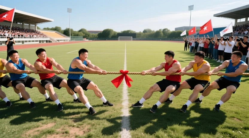 运动会以‘快乐运动、健康同行、凝心聚力、奋发有为’为主题,在轻松活泼、热烈有序的氛围中拉开帷幕。现场共组建四支参赛队伍,围绕团队协作与趣味竞技展开比拼,依次进行‘同舟共济’‘龙卷风’‘俄罗斯方块’‘砥砺前行’及压轴项目‘拔河’五大环节。其中,‘同舟共济’考验队员步调一致与默契配合,参赛者需并肩而立、同起同落,稍有偏差便难以前行;‘龙卷风’则要求队员手拉手围成圆圈快速旋转后迅速散开再重组,既富挑战性又充满欢笑;‘俄罗斯方块’融合智力与反应能力,通过拼图接力提升整体协同效率;‘砥砺前行’以障碍穿越与协作搬运为核心,突出攻坚克难的实干精神;而最终的拔河比赛将全场气氛推向高潮,呐喊声、助威声此起彼伏,充分展现了集体荣誉感与顽强拼搏意志。